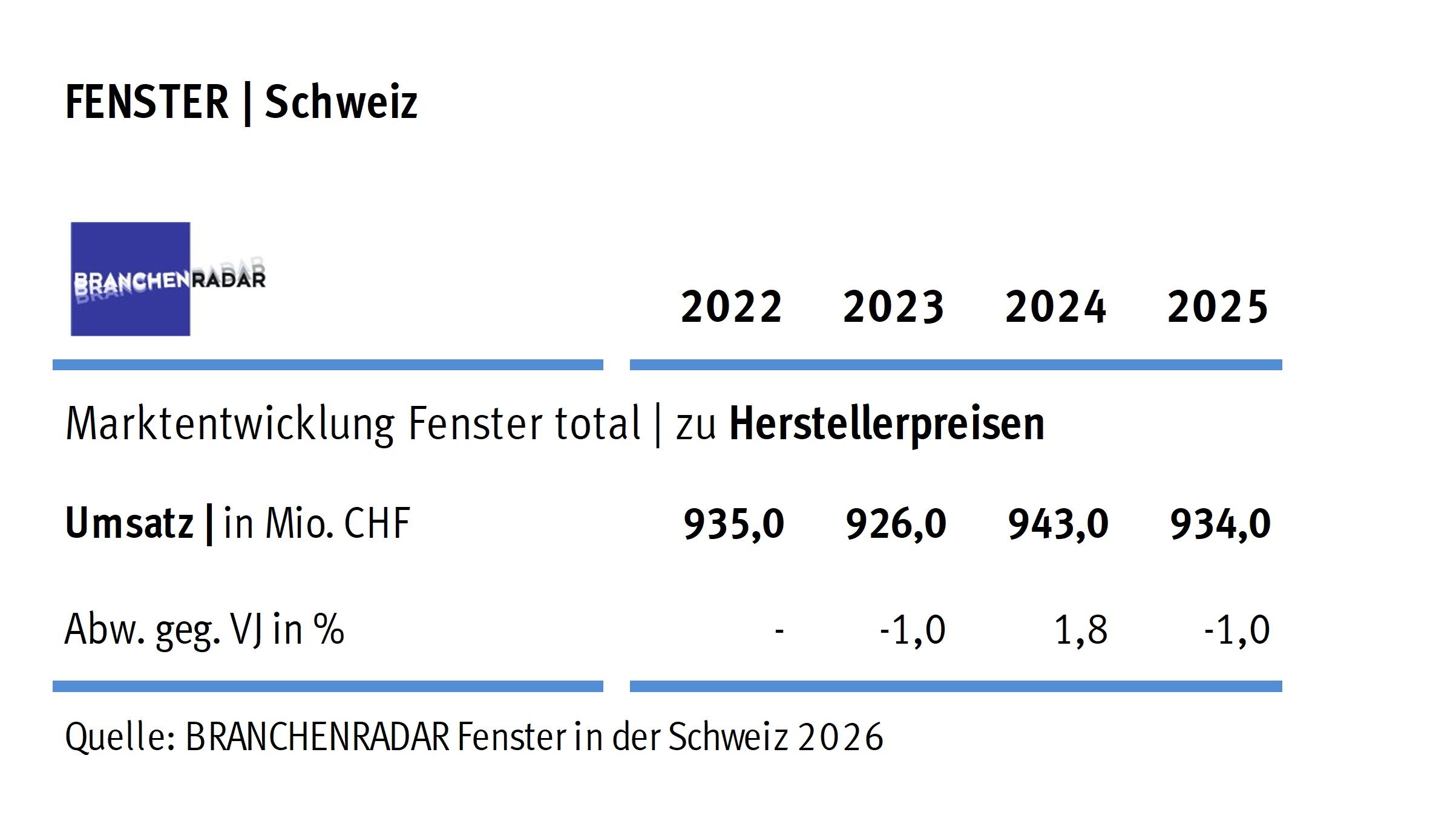 [SCHWEIZ | 5. März 2026] Das Auf und Ab am Fenstermarkt setzte sich auch im vergangenen Jahr fort. Laut aktuellem BRANCHENRADAR Fenster in der Schweiz sanken die Herstellererlöse im Jahr 2025 um 1,0 Prozent gegenüber Vorjahr auf 934 Millionen Schweizer Franken. „Verantwortlich für den leichten Rückgang war das zweite Jahr in Folge ein auffällig schwaches Neubaugeschäft“, analysiert Andreas Kreutzer, Geschäftsführer von BRANCHENRADAR Marktanalyse. Im Jahresvergleich wurde um 6,4 Prozent weniger umgesetzt. Die Sanierung wuchs indessen robust um 2,5 Prozent gegenüber Vorjahr. Umsatzeinbußen gab es bei allen Rahmenmaterialien, mit Ausnahme von Kunststofffenstern.
