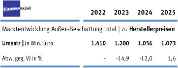 [DEUTSCHLAND | 11. März 2026] Die Talfahrt am Markt für Sonnenschutzsysteme fand im Vorjahr ein jähes Ende, zumindest erlösseitig. Laut aktuellem BRANCHENRADAR Sonnenschutzsysteme in Deutschland wuchs im Jahr 2025 der Herstellerumsatz mit außenliegenden Beschattungssystemen um 1,6 Prozent gegenüber Vorjahr auf 1,07 Milliarden Euro. Der Anstieg war allerdings ausschließlich preisgetrieben. Die Nachfrage sank im Jahresvergleich noch einmal moderat um 1,2 Prozent. In Anbetracht der Tatsache, dass der Markt alleine in den beiden Jahren davor fast 30 Prozent seines Volumens verlor, kommt das kleine Minus im vergangenen Jahr einer Marktstabilisierung gleich.